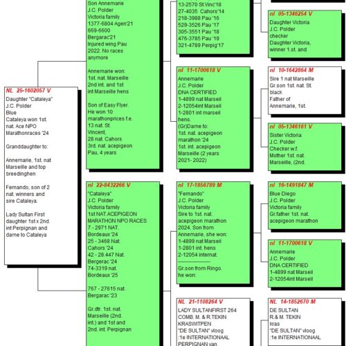 În prezent, crescătoria de reproducție a lui Polder (14 perechi) este formată aproape exclusiv din porumbei consangvini din familia Victoria. Rezultatele din sezoanele extrem de dificile 2024 și 2025 demonstrează că această familie nu și-a pierdut deloc forța: din cele 4 titluri posibile de As Național în Olanda pe 2 ani, Polder câștigă 3! Super Lars și Mighty Mike au demonstrat că pot rezista la 3 curse de maraton de 1000 km în 6 săptămâni, iar Super Lars chiar doi ani consecutiv. În niciuna dintre aceste curse nu s-a atins viteza de 1000 m/min. Cataleya a reușit performanțe remarcabile în cursele cu lansare la prânz, într-un interval de 8 săptămâni.