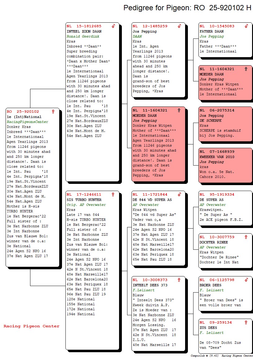 Parintii acestui pui pot fi vazuti pe www.pigeoncenter.roAcest porumbel este reprodus in Romania de catre PigeonCenter. Reproducatorii PigeonCenter sunt porumbei PREMIUM, de inalta calitate genetica, importati din Olanda, Belgia, Germania. Va rugam verificati disponibilitatea la numarul 0786 892 815. Varsta porumbelului este mai mare decat cea vizibila in poze, lucru cauzat de durata de prelucrare si expunere a pozelor de la momentul fotografierii. In cele mai multe cazuri estimam ca aceasta perioada sa fie cuprinsa intre 2 si 3 saptamani.Atentie! Nu putem garanta sexul acestui porumbel; am estimat sexul acestui porumbel la momentul fotografierii, dar nu putem garanta ca estimarea este una corecta!Detalii despre parinti si perechile de reproductie se gasesc pe www.PigeonCenter.roAcest porumbel vine insotit de pedigree si talon de proprietate. In primele 2 saptamani de la primire, porumbelul poate fi inlocuit sau contravaloarea lui returnata, in cazul in care se intampla ceva cu porumbelul din vina vanzatorului (din vina noastra). Livrarea lui este gratuita si posibila in fiecare zi de miercuri, in aproape toate orasele din tara. Va rugam sa ne contactati pentru detalii la numarul 0786 892 815 sau email piatadeporumbei@gmail.com