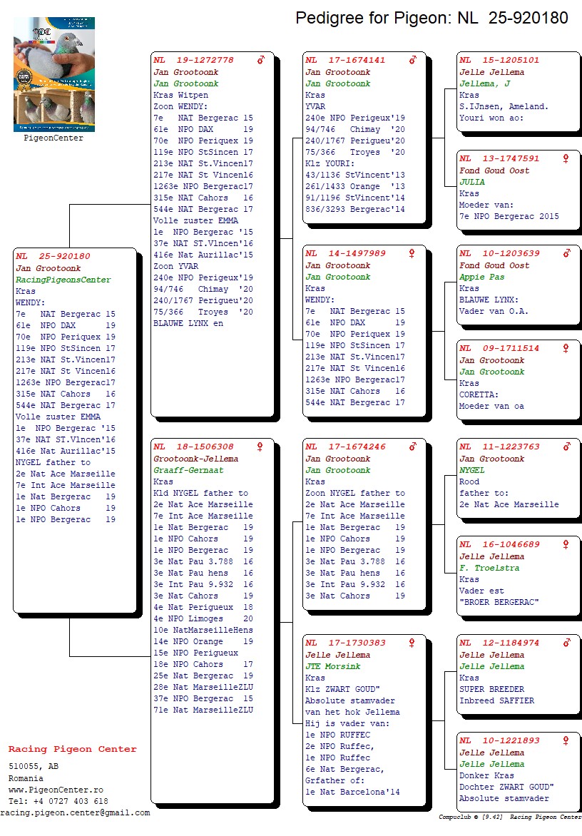Parintii acestui pui pot fi vazuti pe www.pigeoncenter.roAcest porumbel este reprodus in Romania de catre PigeonCenter. Reproducatorii PigeonCenter sunt porumbei PREMIUM, de inalta calitate genetica, importati din Olanda, Belgia, Germania. Va rugam verificati disponibilitatea la numarul 0786 892 815. Varsta porumbelului este mai mare decat cea vizibila in poze, lucru cauzat de durata de prelucrare si expunere a pozelor de la momentul fotografierii. In cele mai multe cazuri estimam ca aceasta perioada sa fie cuprinsa intre 2 si 3 saptamani.Atentie! Nu putem garanta sexul acestui porumbel; am estimat sexul acestui porumbel la momentul fotografierii, dar nu putem garanta ca estimarea este una corecta!Detalii despre parinti si perechile de reproductie se gasesc pe www.PigeonCenter.roAcest porumbel vine insotit de pedigree si talon de proprietate. In primele 2 saptamani de la primire, porumbelul poate fi inlocuit sau contravaloarea lui returnata, in cazul in care se intampla ceva cu porumbelul din vina vanzatorului (din vina noastra). Livrarea lui este gratuita si posibila in fiecare zi de miercuri, in aproape toate orasele din tara. Va rugam sa ne contactati pentru detalii la numarul 0786 892 815 sau email piatadeporumbei@gmail.com