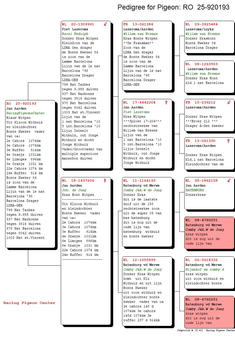 Parintii acestui pui pot fi vazuti pe www.pigeoncenter.roAcest porumbel este reprodus in Romania de catre PigeonCenter. Reproducatorii PigeonCenter sunt porumbei PREMIUM, de inalta calitate genetica, importati din Olanda, Belgia, Germania. Va rugam verificati disponibilitatea la numarul 0786 892 815. Varsta porumbelului este mai mare decat cea vizibila in poze, lucru cauzat de durata de prelucrare si expunere a pozelor de la momentul fotografierii. In cele mai multe cazuri estimam ca aceasta perioada sa fie cuprinsa intre 2 si 3 saptamani.Atentie! Nu putem garanta sexul acestui porumbel; am estimat sexul acestui porumbel la momentul fotografierii, dar nu putem garanta ca estimarea este una corecta!Detalii despre parinti si perechile de reproductie se gasesc pe www.PigeonCenter.roAcest porumbel vine insotit de pedigree si talon de proprietate. In primele 2 saptamani de la primire, porumbelul poate fi inlocuit sau contravaloarea lui returnata, in cazul in care se intampla ceva cu porumbelul din vina vanzatorului (din vina noastra). Livrarea lui este gratuita si posibila in fiecare zi de miercuri, in aproape toate orasele din tara. Va rugam sa ne contactati pentru detalii la numarul 0786 892 815 sau email piatadeporumbei@gmail.com